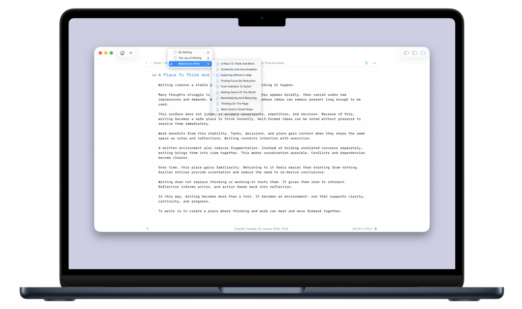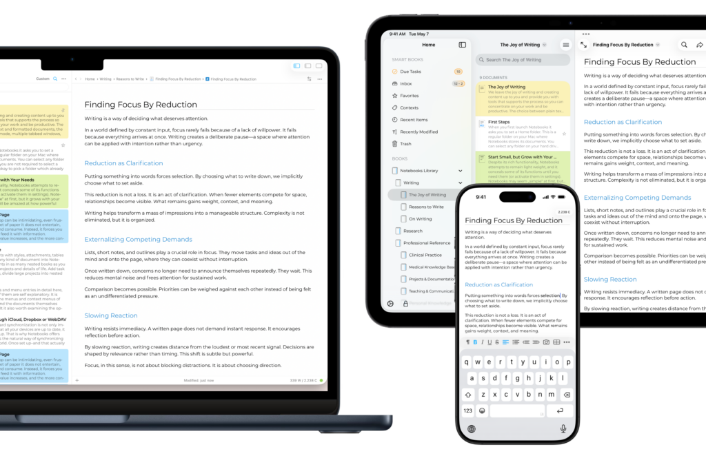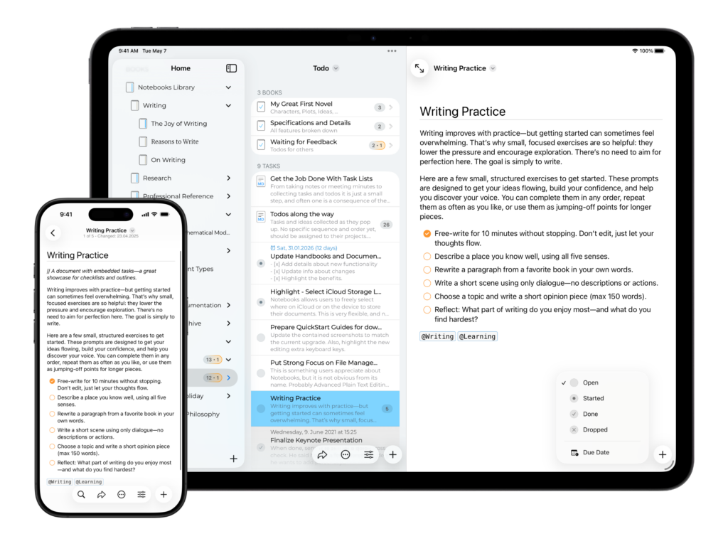 Notebooks is about writing in any form and shape: jot down notes and memos, write diary entries, collect information for a research paper, or type the chapters of a novel. Start simple, refine later, and let your writing take shape at its own pace.