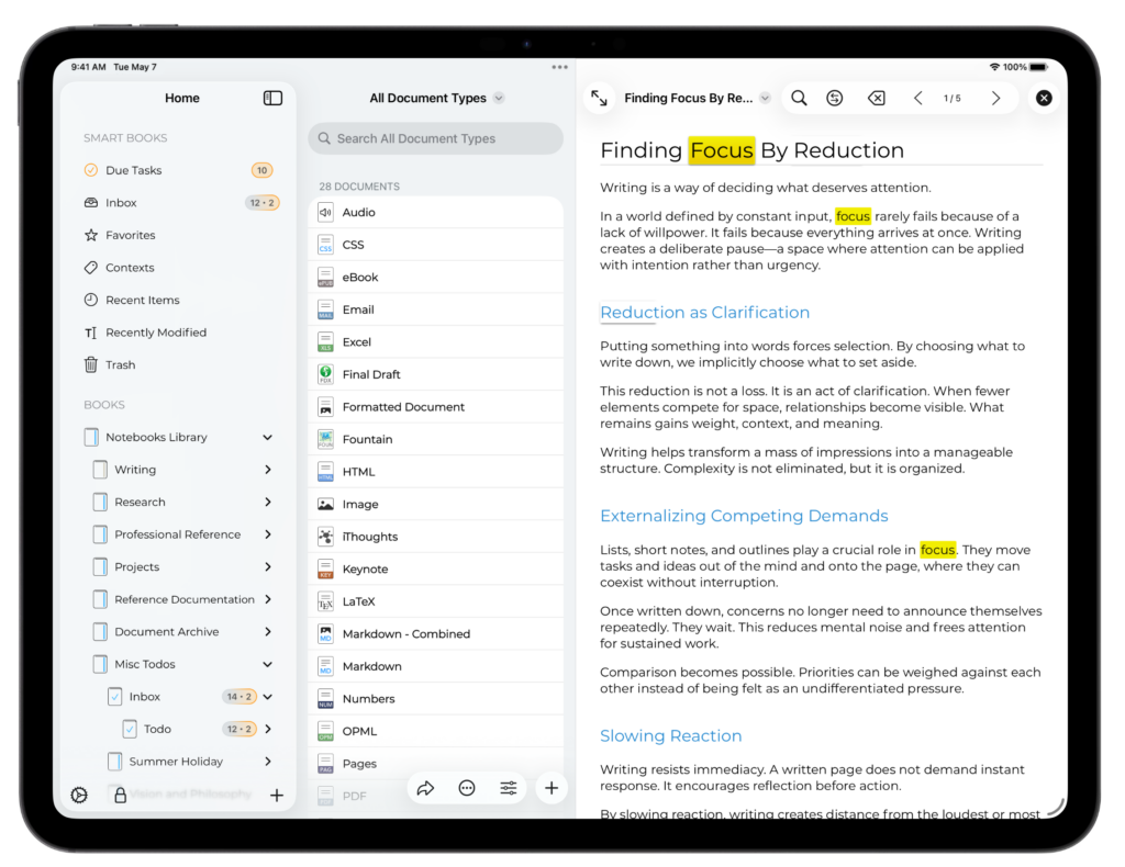 Reduce friction and distractions, so you can stay with your work, whether you are writing, planning, or reviewing information.